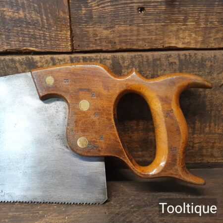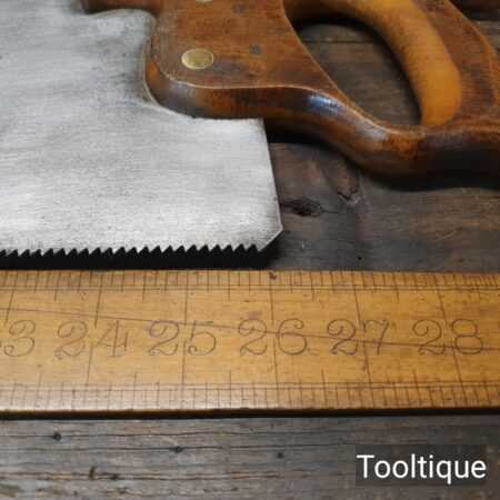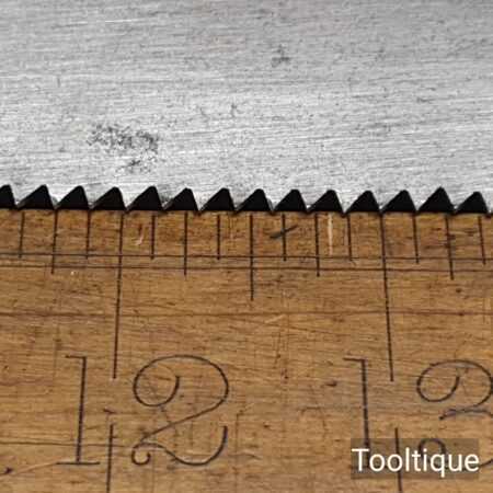 The saw has been thoroughly cleaned, jointed, resharpened, and set by hand so that all the hard work of getting an old vintage saw right has been undertaken. We do this so that the next sharpening is easier and no more than a quick freshen up would be required. Those who are familiar with sharpening will know this is no small job and requires skill, effort, and time to achieve good results.