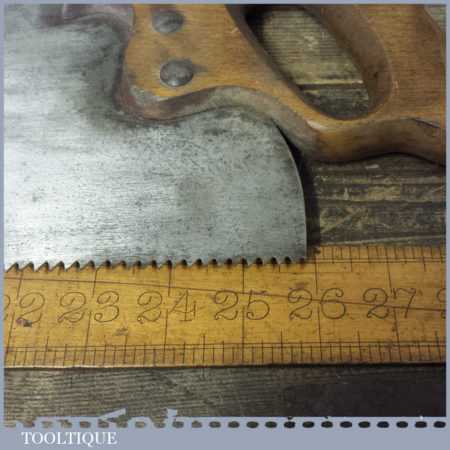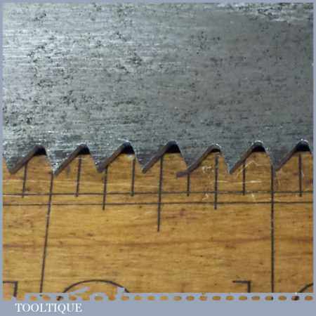 The saw has been thoroughly cleaned, jointed, resharpened and set by hand so that all the hard work of getting an old vintage saw right has been undertaken. We do this so that the next sharpening is easier and no more than a quick freshen up would be required. Those who are familiar with sharpening will know this is no small job and requires skill, effort and time to achieve good results.