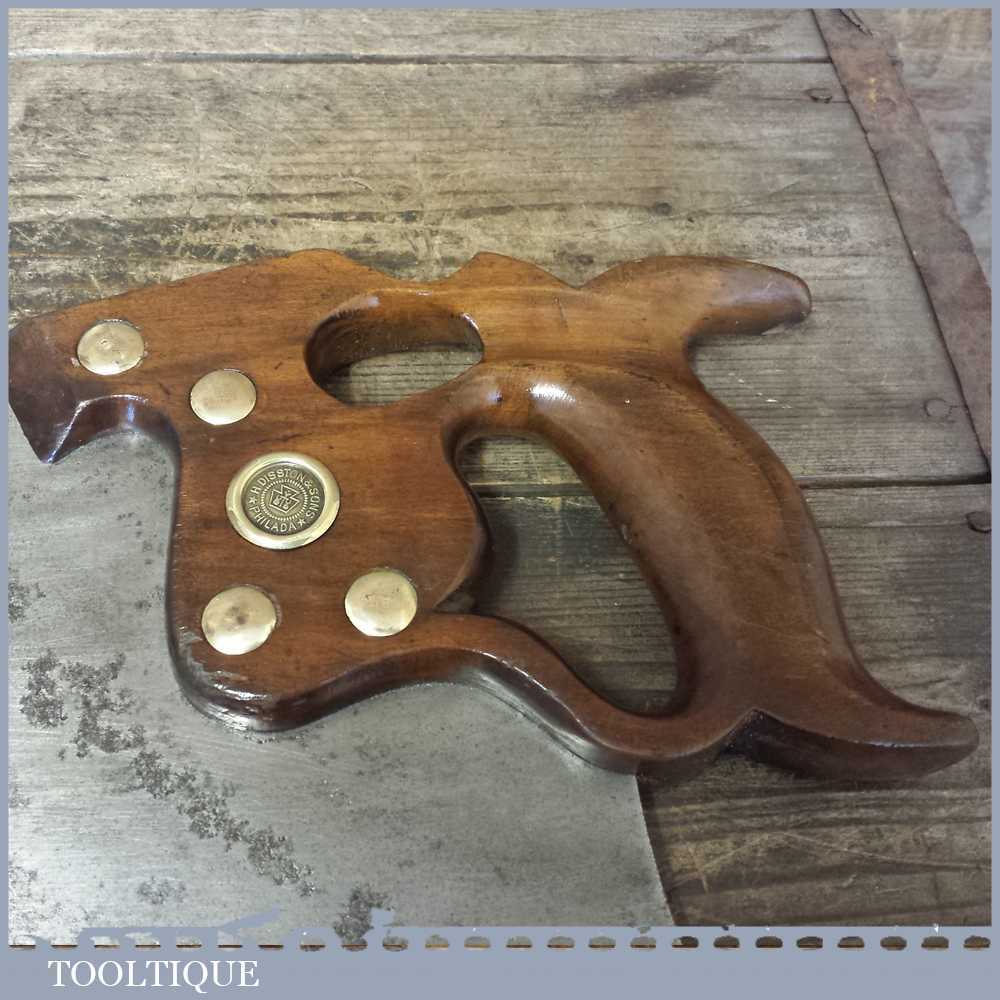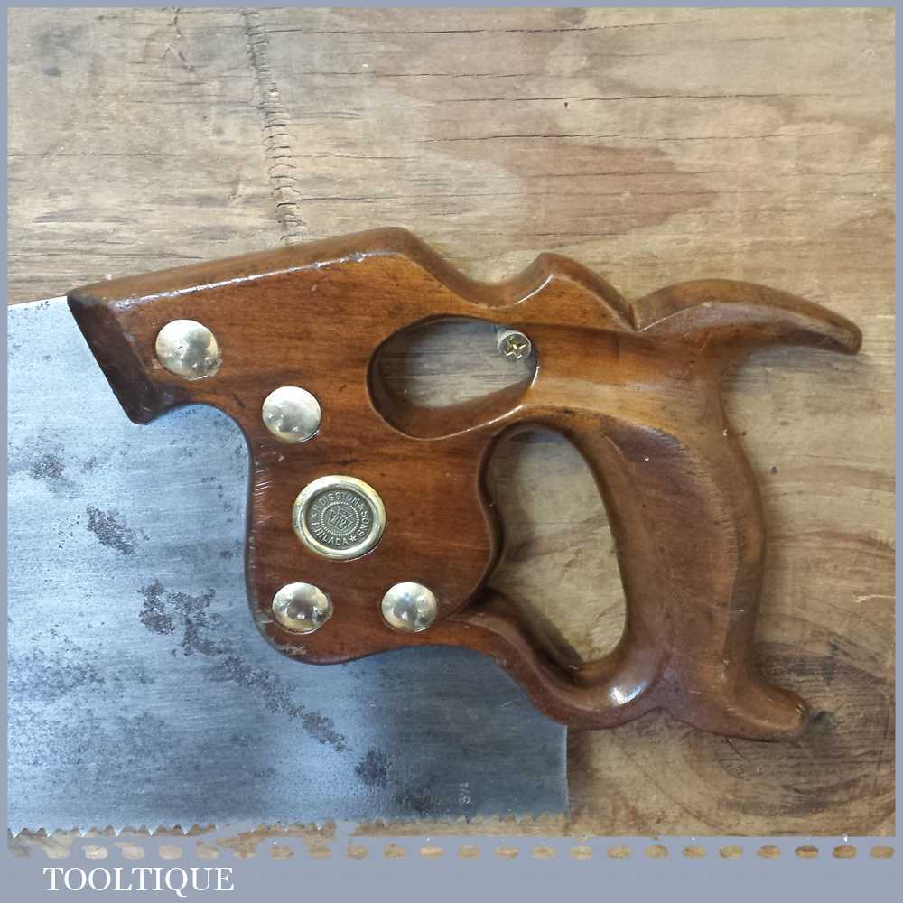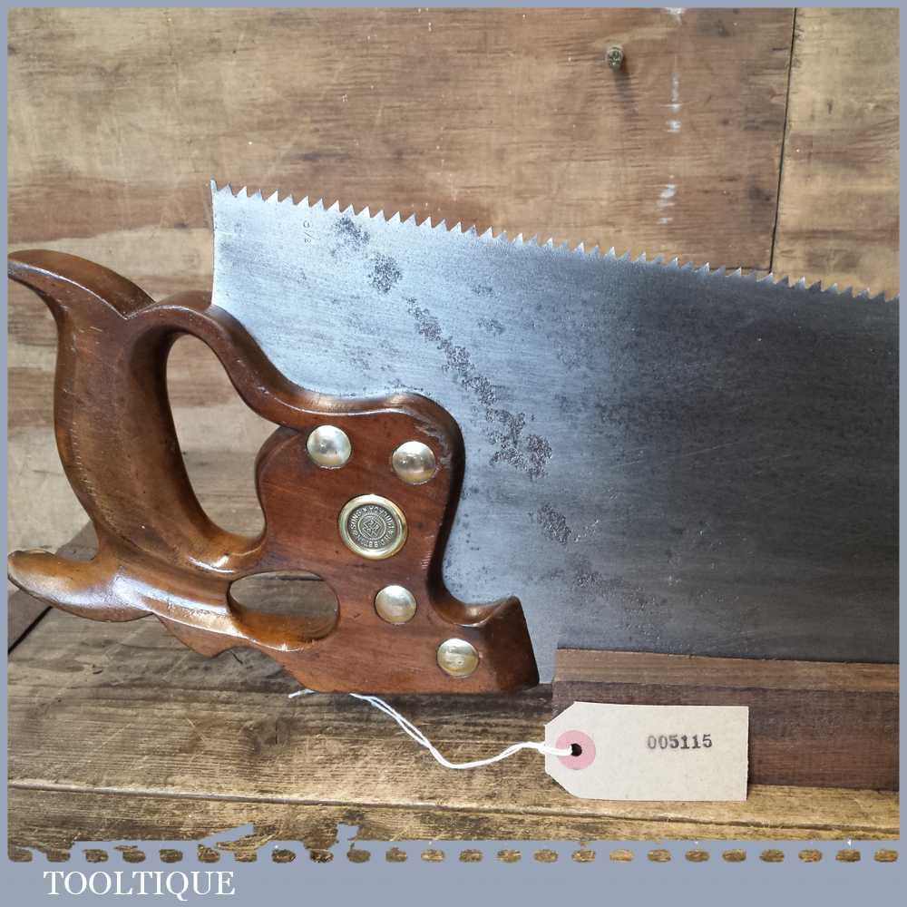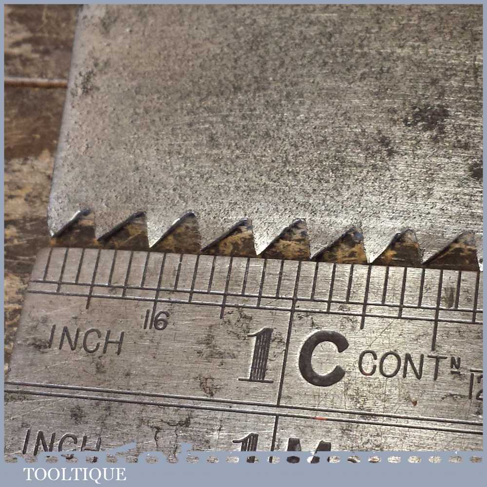 The saw has been thoroughly cleaned including under the handle, jointed, resharpened and set by hand so that all the hard work of getting an old vintage saw right has been undertaken. We do this so that the next sharpening is easier and no more than a quick freshen up would be required. Those who are familiar with sharpening will know this is no small job and requires skill, effort and time to achieve good results.