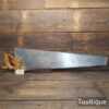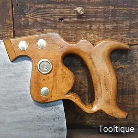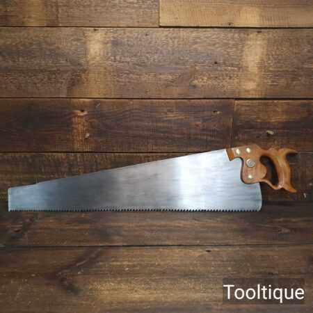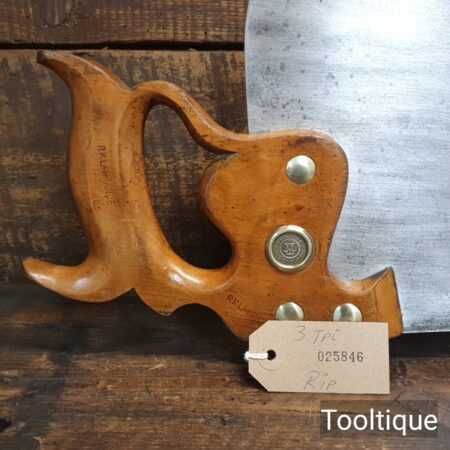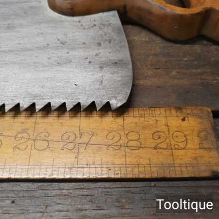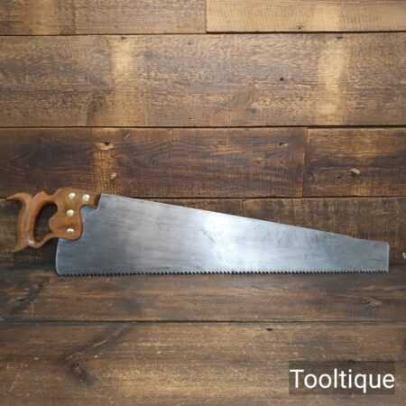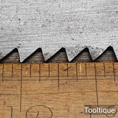 The saw has been thoroughly cleaned, jointed, resharpened, and set by hand so that all the hard work of getting an old vintage saw right has been undertaken. We do this so that the next sharpening is easier and no more than a quick freshen up would be required. Those who are familiar with sharpening will know this is no small job and requires skill, effort, and time to achieve good results.