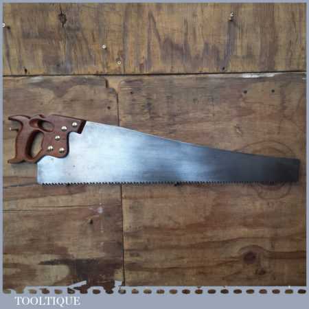 Vintage 28” Henry Disston, Philadelphia USA D8 rip saw with 3 tpi, fully refurbished and sharpened ready for use. This old saw has the thumb hole grip in the applewood handle for a two-handed thrust. Note: Old timers often regarded these old Philly Disston’s as the best saws ever produced by any saw maker, before or since. These are pretty hard to find in good condition this saw used up a saw file and a whole lot of hard work to get the tooth line back into this condition.