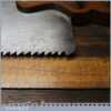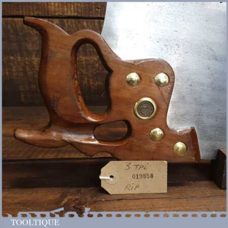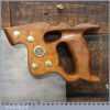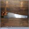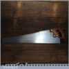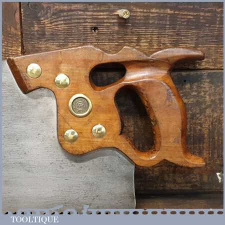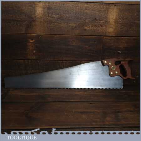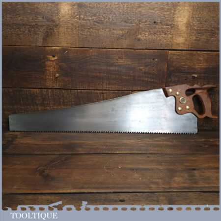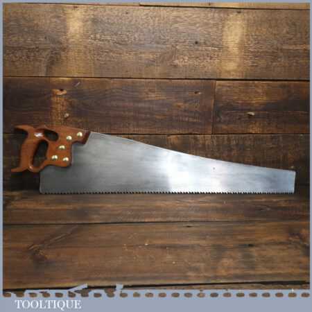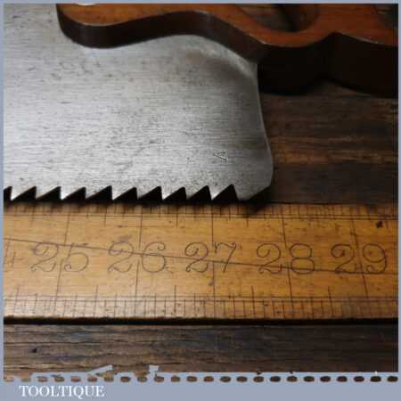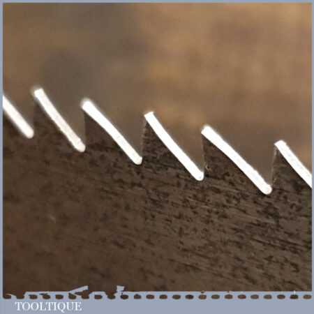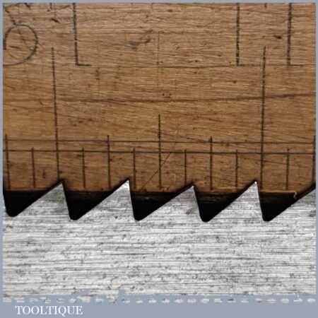 The saw has been thoroughly cleaned, jointed, resharpened and set by hand so that all the hard work of getting an old vintage saw right has been undertaken. We do this so that the next sharpening is easier and no more than a quick freshen up would be required. Those who are familiar with sharpening will know this is no small job and requires skill, effort and time to achieve good results.