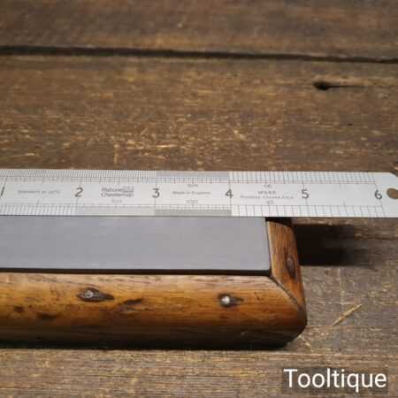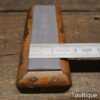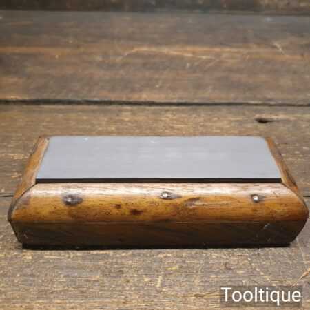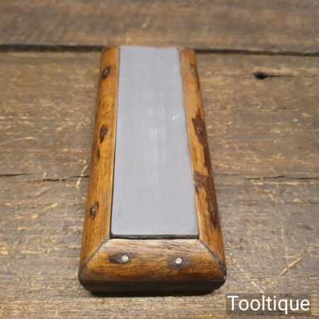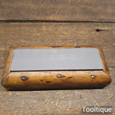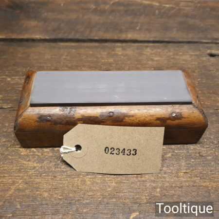 Vintage 4 ½” x 1 ½” fine grade natural welsh slate honing stone on a nice mitred wooden base in good used condition, lapped flat ready for use. Suitable for use with a good quality lapping fluid, see our Acutus Brand in store.