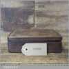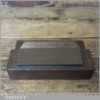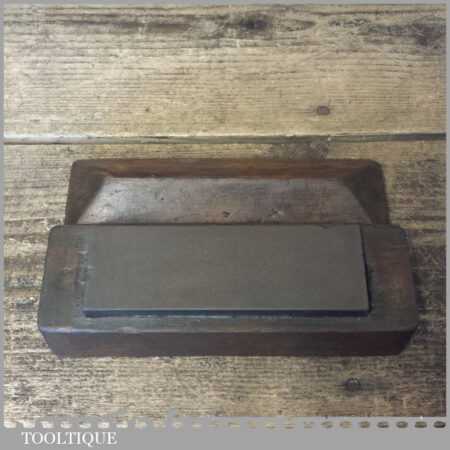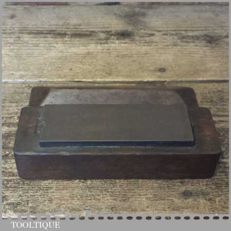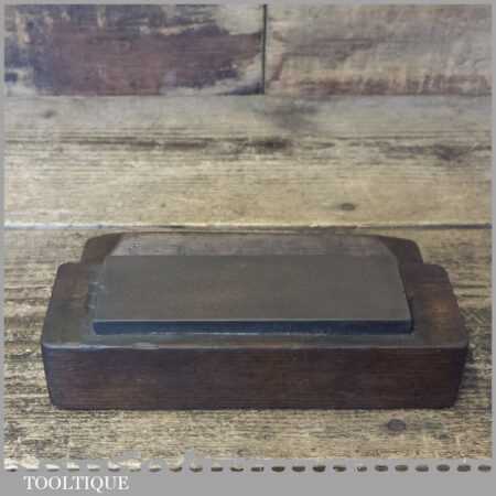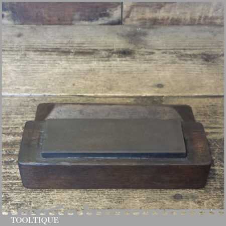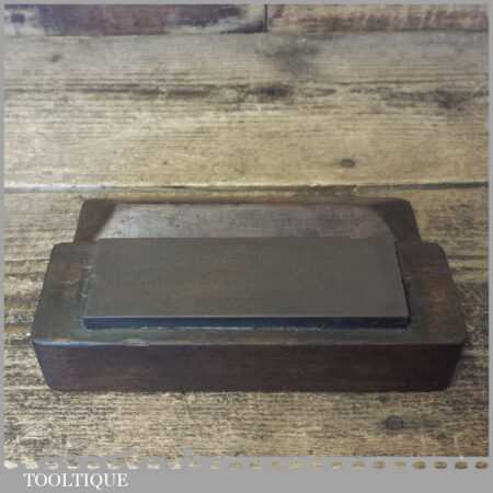 Vintage 4 ½” x 1 ½” India oil stone in mahogany box and in good used condition. Note: this stone has been lapped flat ready for use.