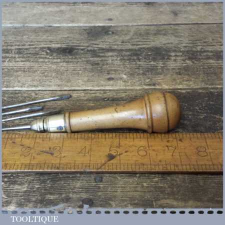 Vintage boxwood and brass multi tool with 4 attachments encased in the screw top handle, in good used condition.
