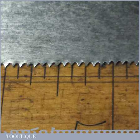 The saw has been thoroughly cleaned, jointed, resharpened and set by hand so that all the hard work of getting an old vintage saw right has been undertaken. We do this so that the next sharpening is easier and no more than a quick freshen up would be required. Those who are familiar with sharpening will know this is no small job and requires skill, effort and time to achieve good results.