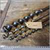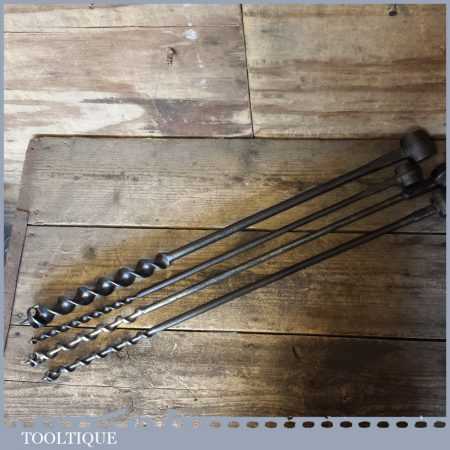 4 No: Vintage bull nose Scotch Barrel Eyed Timber Framing Auger Bits in good used condition. These robust augers are good for use in end grain, and at an angle to a surface because there are no spurs to catch and throw it off line and can be used to enlarge an existing hole, and can be sharpened with a round file, this type of vintage auger is hard to find. Sizes ½” 5/8” 1 1/16” 1 ¼”
