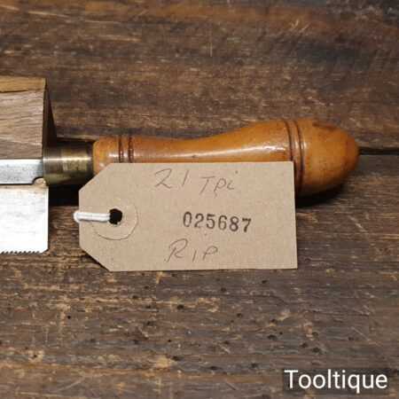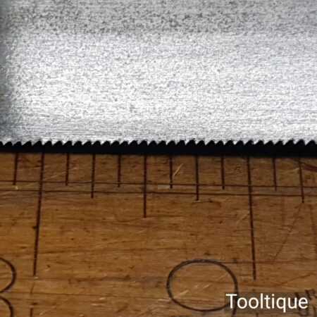The saw has been thoroughly cleaned including under the handle, jointed, resharpened and set by hand so that all the hard work of getting an old vintage saw right has been undertaken. We do this so that the next sharpening is easier and no more than a quick freshen up would be required. Those who are familiar with sharpening will know this is no small job and requires skill, effort and time to achieve good results