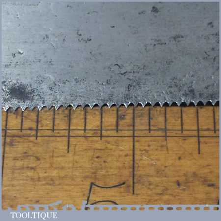 The saw has been thoroughly cleaned, jointed, resharpened and set by hand so that all the hard work of getting an old vintage saw right has been undertaken. We do this so that the next sharpening is easier and no more than a quick freshen up would be required. Those who are familiar with sharpening will know this is no small job and requires skill, effort and time to achieve good results.