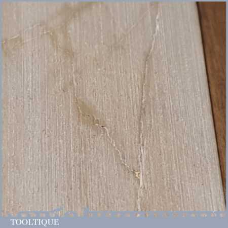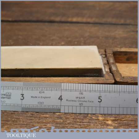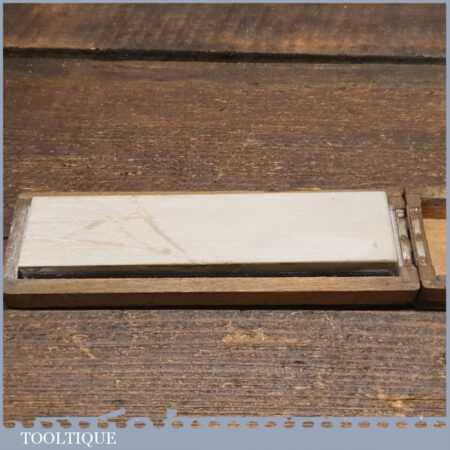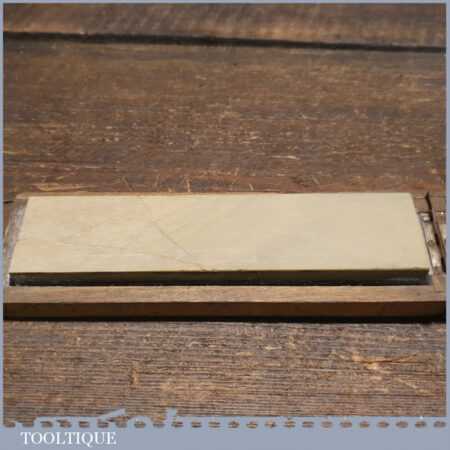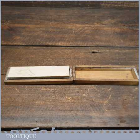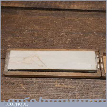 Vintage 5” x 1 ¼” natural coticule fine grade honing stone in wooden box, in good used condition. Note: Lapped flat ready for use
