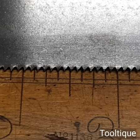The saw has been thoroughly cleaned, jointed, resharpened, and set by hand so that all the hard work of getting an old vintage saw right has been undertaken. We do this so that the next sharpening is easier and no more than a quick freshen up would be required. Those who are familiar with sharpening will know this is no small job and requires skill, effort, and time to achieve good results.
