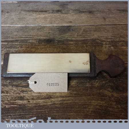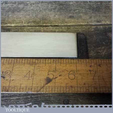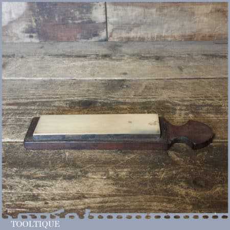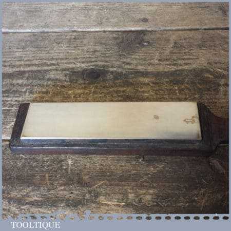 Vintage 6” x 1 ½” Coticule natural wet stone on nicely shaped mahogany base and in good used condition. Note: lapped flat ready for use revealing the top white layer is wearing thin at one end.