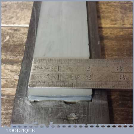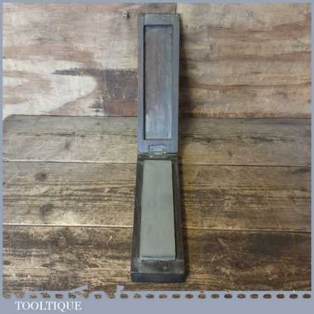 Vintage 7 ¾” x 2″ medium grit Carborundum oil stone in a mahogany box in good usable condition.