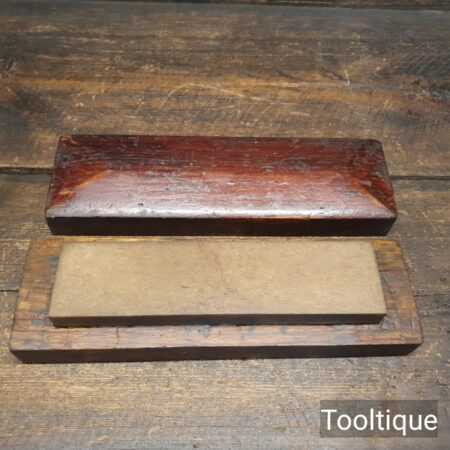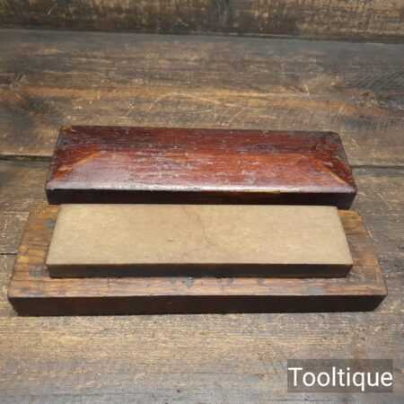 Vintage 7 ¾” x 2” natural Washita honing oilstone in mahogany box and in good used condition. Note: lapped flat ready for use.