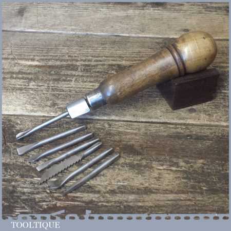 Vintage beechwood and brass multi tool with 7 No. attachments encased in the screw top handle, in good used condition.