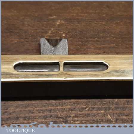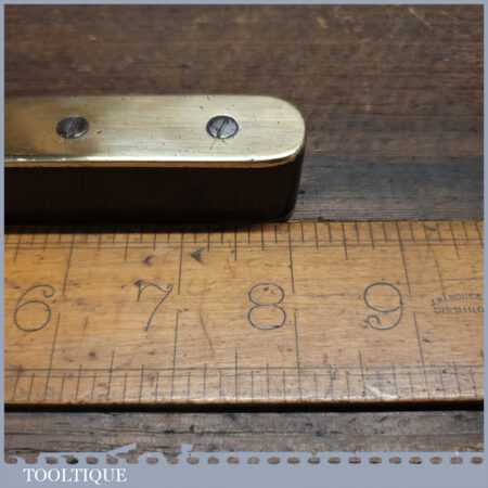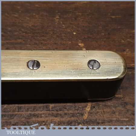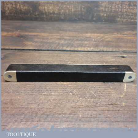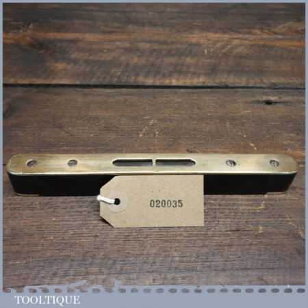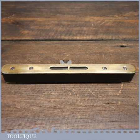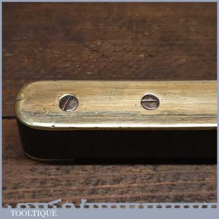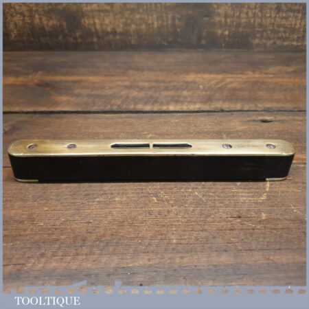 Vintage 8” ebony and brass spirit level with original clear bubble tube, in good used condition. Note: the level hasn’t been tested and may require resetting in putty if intended for use.