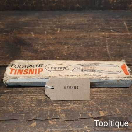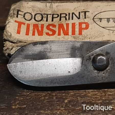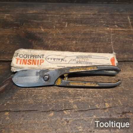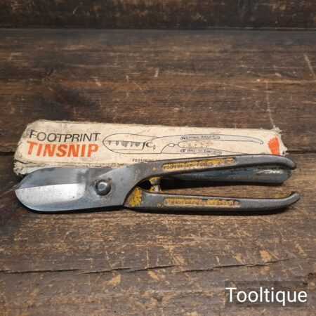 Vintage 8” Footprint Sheffield flat tinsnips, refurbished ready for use and in good used condition. Note: Sharpened and will cut tin from the edge without the material curling.
