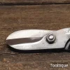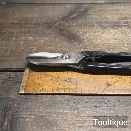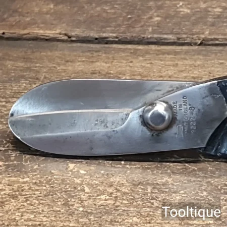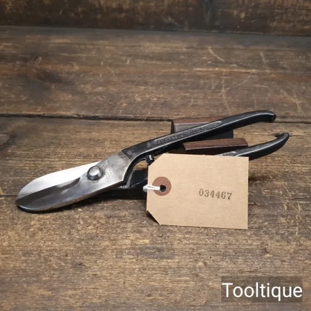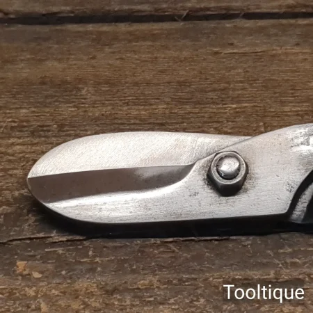 Vintage 8” Footprint Sheffield Right-Handed Flat Tinsnips, sharpened & refurbished ready for use and in good used condition. Note: These cut tin from the edge like new.
