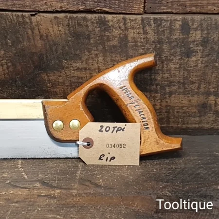 Vintage 8” Spear & Jackson Brass Back 20 Tpi Dovetail Saw with a Beechwood Handle, fully refurbished and sharpened ready for use and in good used condition. Note: Brass Studs, not to be compared to modern types which have softer saw plates. The saw has been thoroughly cleaned, jointed, resharpened and set by hand so that all the hard work of getting an old vintage saw right has been undertaken. We do this so that the next sharpening is easier and no more than a quick freshen up would be required. Those who are familiar with sharpening will know this is no small job and requires skill, effort and time to achieve good results.