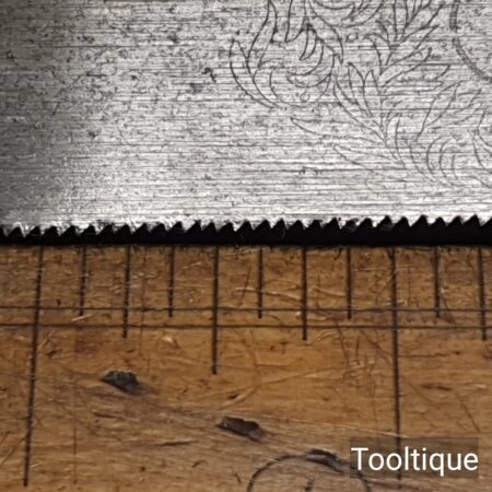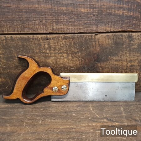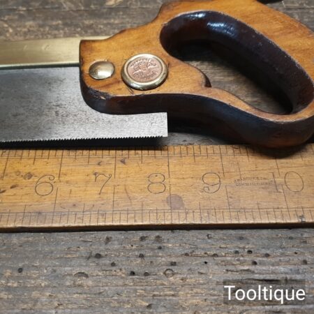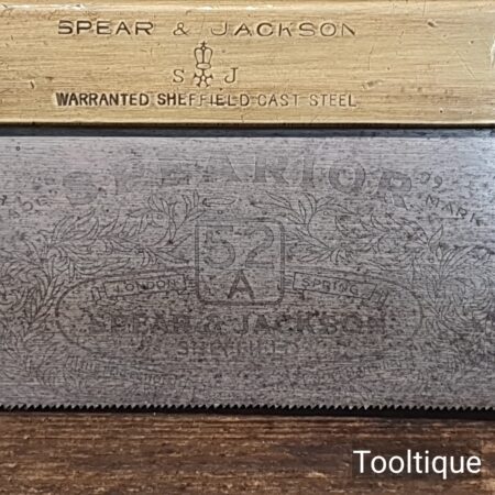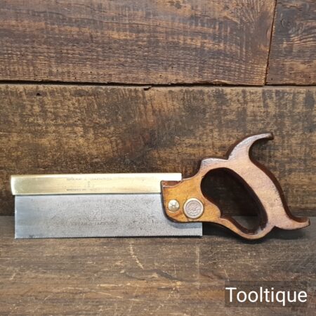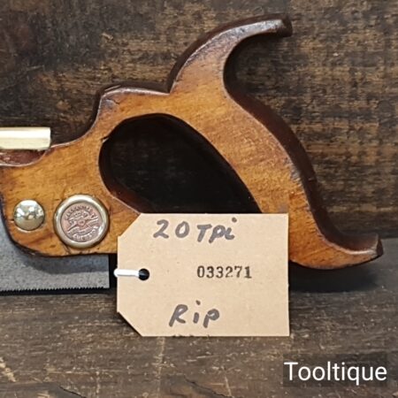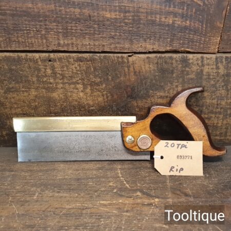 Vintage 8” Spear & Jackson No: 52A Brass Back Dovetail Saw with 20 Tpi, refurbished ready for use and in good used condition. Sharpened Rip. The saw has been thoroughly cleaned, jointed, resharpened and set by hand so that all the hard work of getting an old vintage saw right has been undertaken. We do this so that the next sharpening is easier and no more than a quick freshen up would be required. Those who are familiar with sharpening will know this is no small job and requires skill, effort and time to achieve good results.