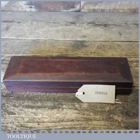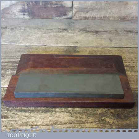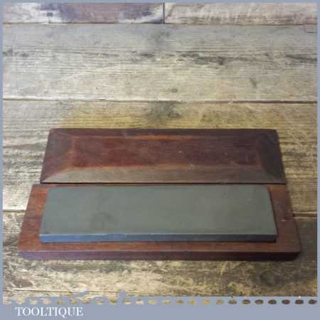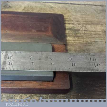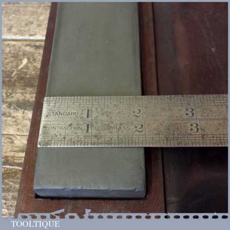 Good vintage 8” x 2″ medium grit carborundum oil stone in a mahogany box in good used condition.