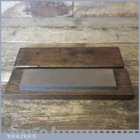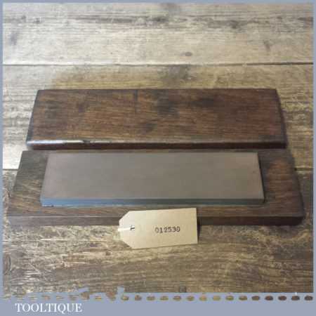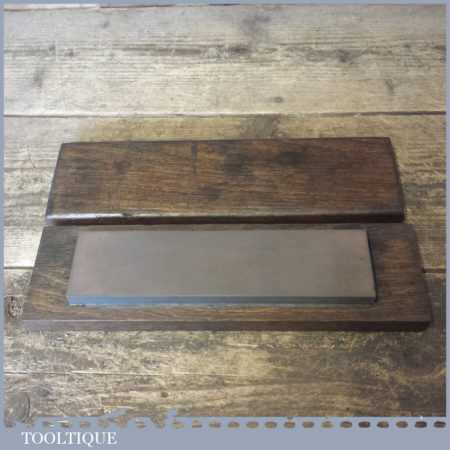 Vintage 8” x 2” Carborundum oil stone in mahogany box and in good used condition. Note: this stone has been lapped flat ready for use.