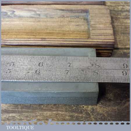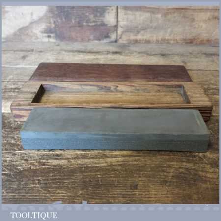 Vintage 8” x 2” coarse and medium grit combination oil stone in pine box and in good used condition. Note: Lapped flat ready for use.