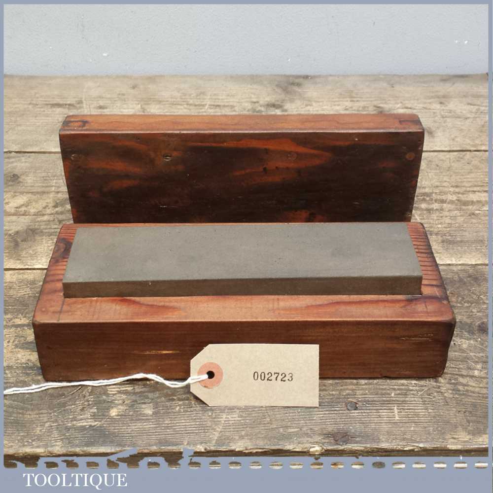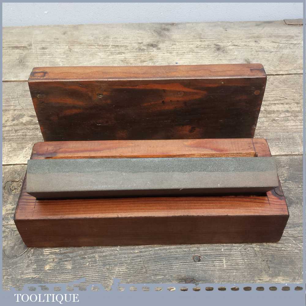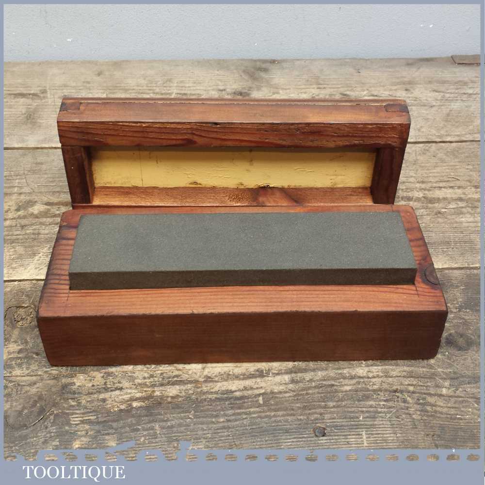 Vintage 8” x 2” India Oil stone in large protective pine box in good used condition.