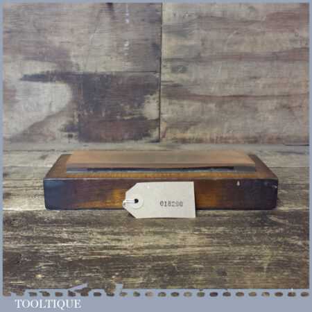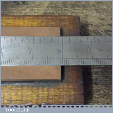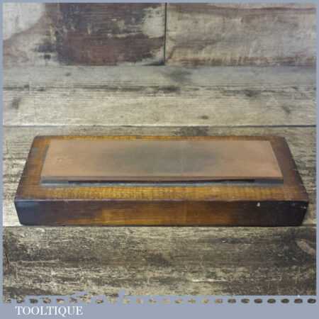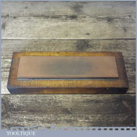 Vintage 8” x 2” India oil stone on a pine base and in good used condition. Note: this stone has been lapped flat ready for use.