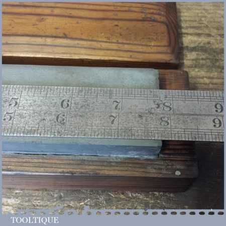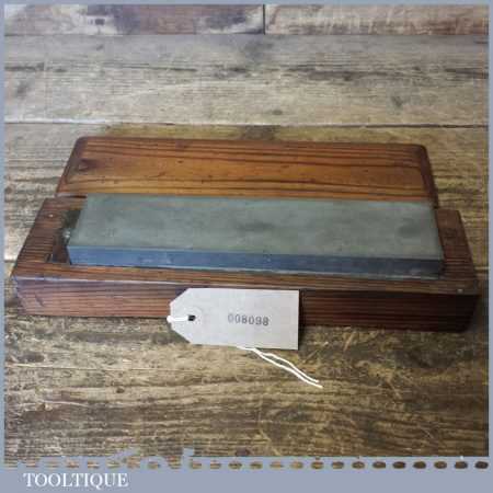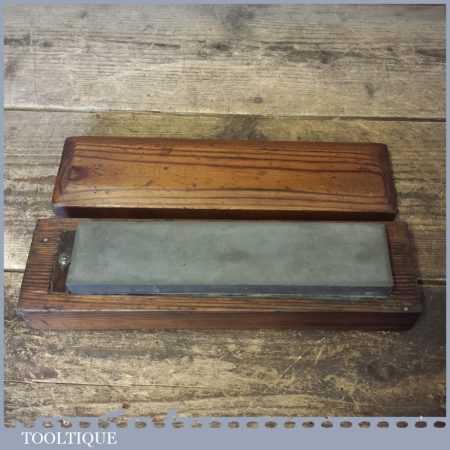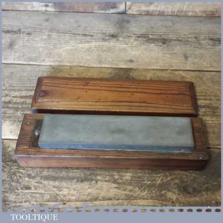 Vintage approx 8” x 2” medium grit Carborundum oil stone in a nice pine wooden box in good used condition.