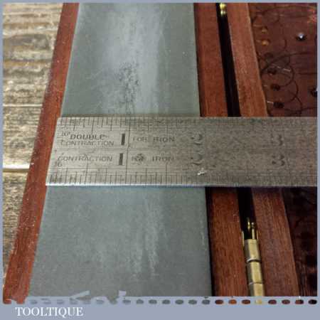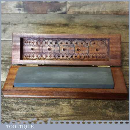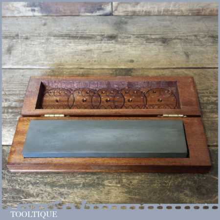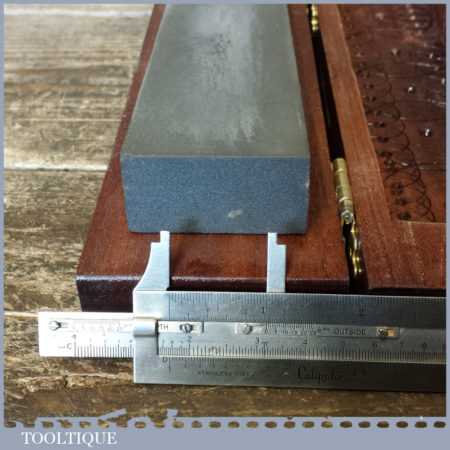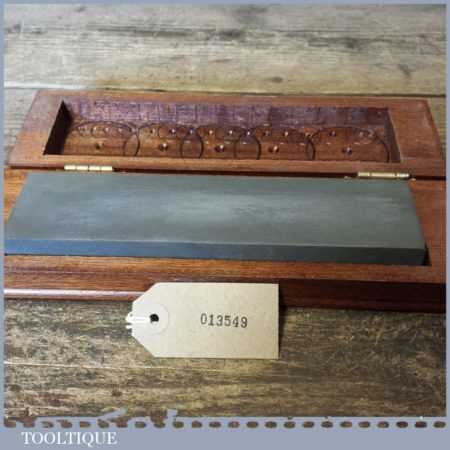 Vintage 8” x 2” medium grit oil stone in new mahogany box in good used condition.