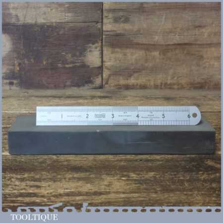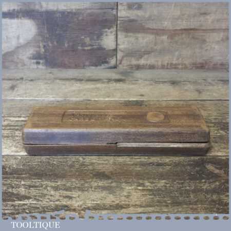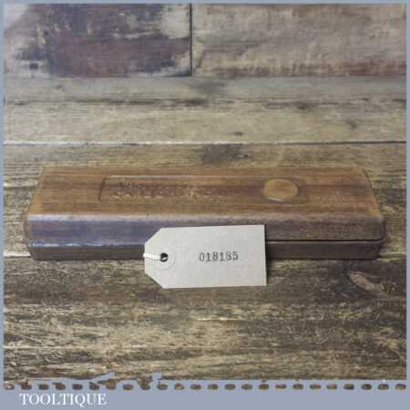 Vintage 8”x 2”x 1” carborundum oil stone in mahogany box and in good used condition. Note: this stone has been lapped flat ready for use.