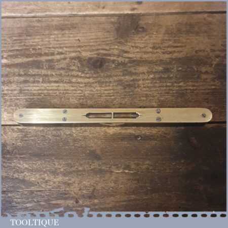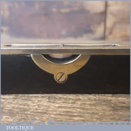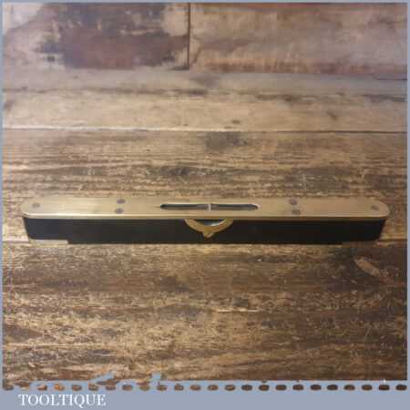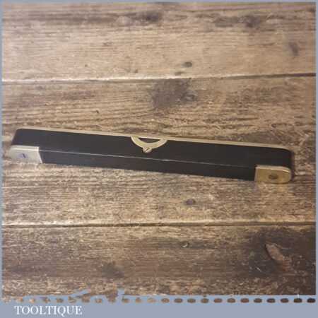 Vintage 9” ebony and heavy brass spirit level with original clear bubble tube, in good used condition. Note: the level hasn’t been tested and may require resetting in putty if intended for use.