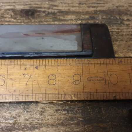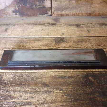 Vintage 9” x 1 ⅝” natural Charnley Forest oil stone on a pine base and in good used condition. Note: Lapped flat ready for use