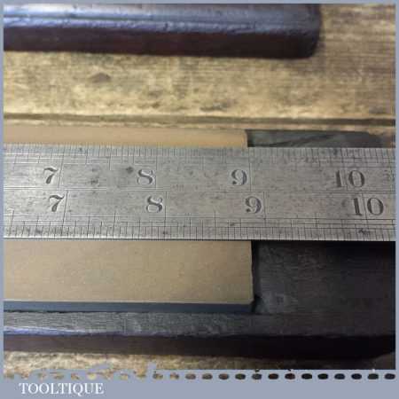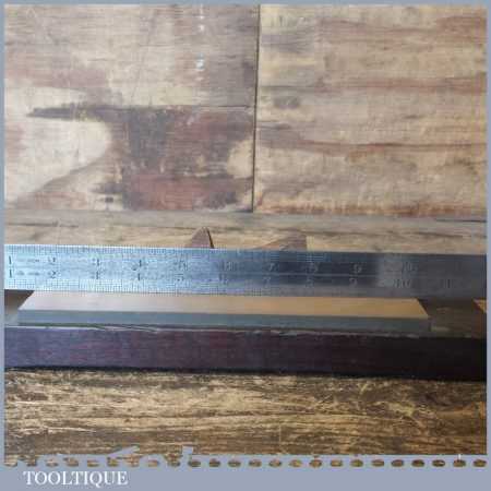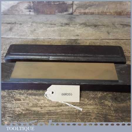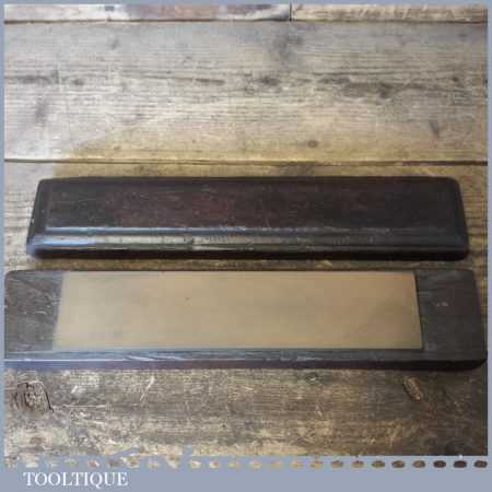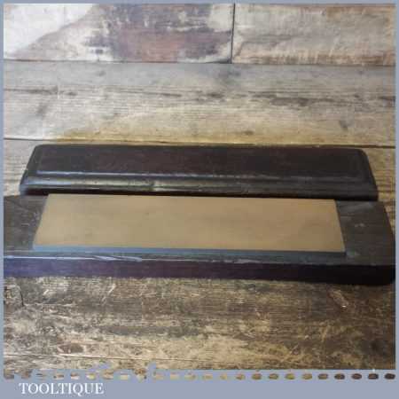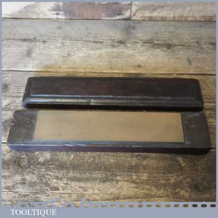 Vintage medium grit oil stone in a wooden box measuring 9” in length and 2” in width in good used condition. The stone is an odd size 9 x 2 which suggests this is not a commercial man made one, although i cannot be certain. Its a lovely stone.