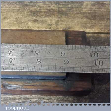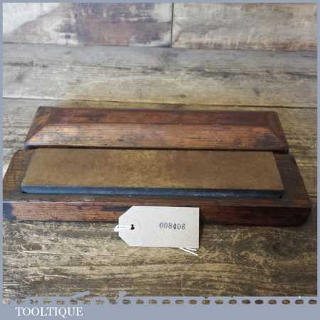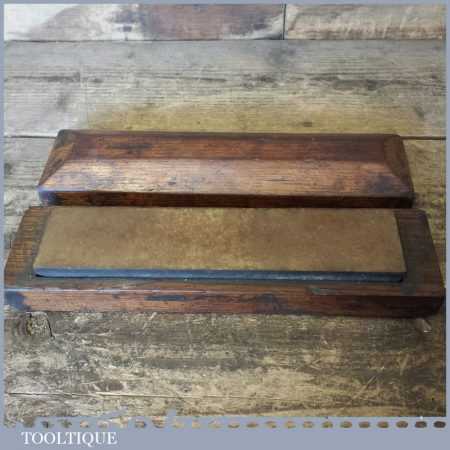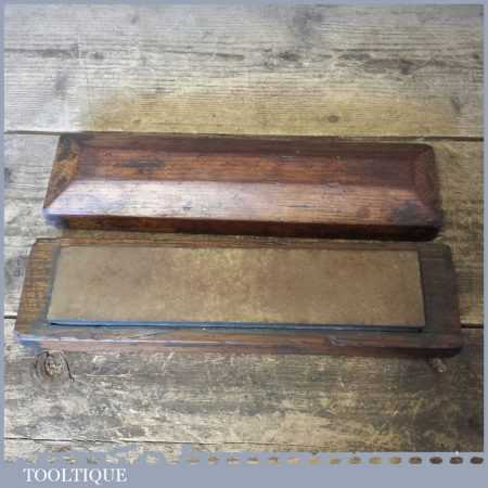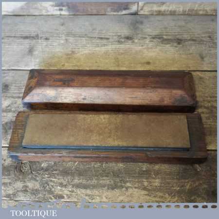 Vintage natural Washita oil stone in a wooden box measuring 9” in length and 2” in width in good used condition. Note: this stone has been lapped flat ready for use.