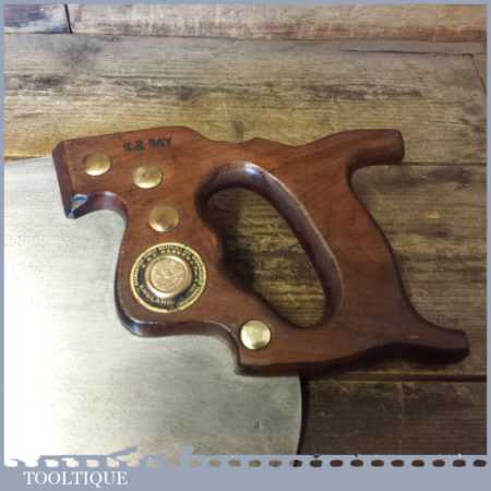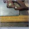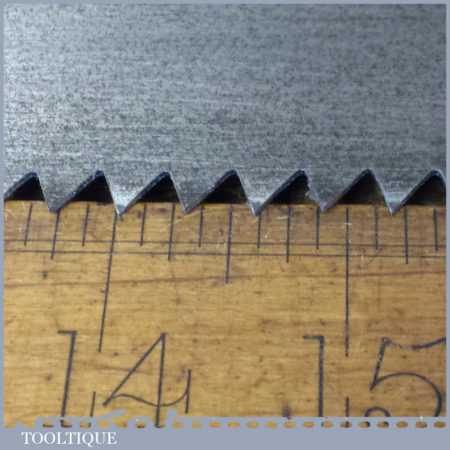 The saw has been thoroughly cleaned, jointed, resharpened and set by hand so that all the hard work of getting an old vintage saw right has been undertaken. We do this so that the next sharpening is easier and no more than a quick freshen up would be required. Those who are familiar with sharpening will know this is no small job and requires skill, effort and time to achieve good results.