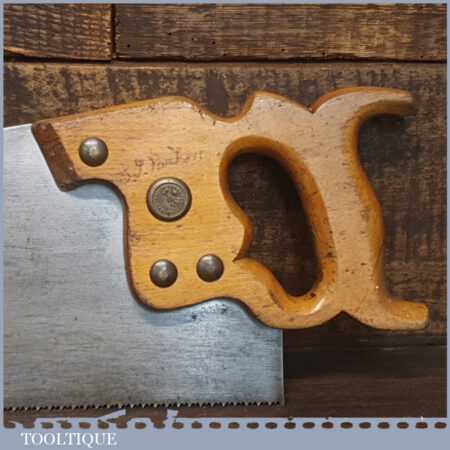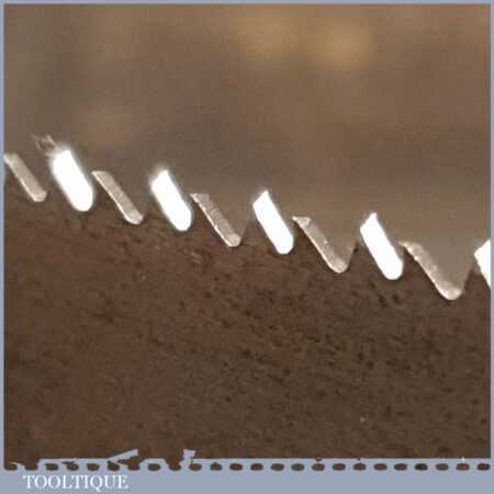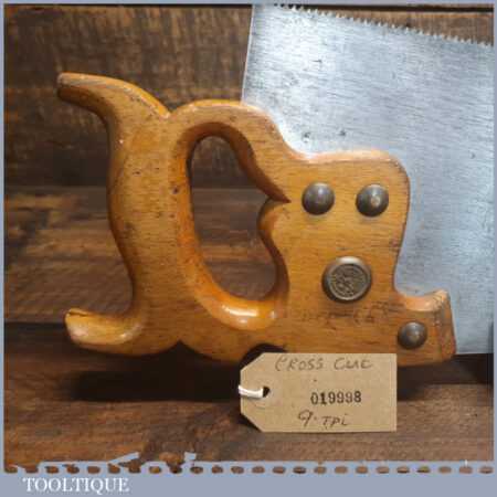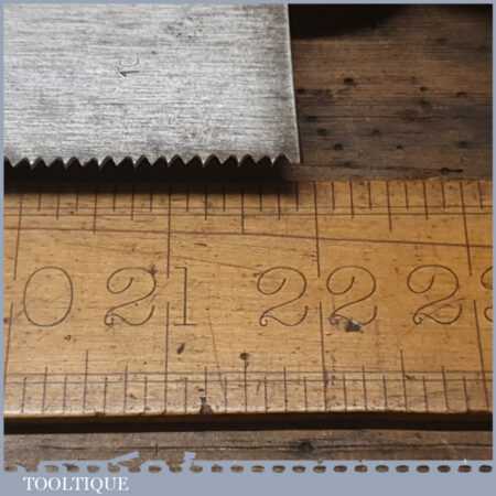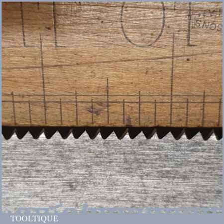 The saw has been thoroughly cleaned, jointed, resharpened and set by hand so that all the hard work of getting an old vintage saw right has been undertaken. We do this so that the next sharpening is easier and no more than a quick freshen up would be required. Those who are familiar with sharpening will know this is no small job and requires skill, effort and time to achieve good results.
