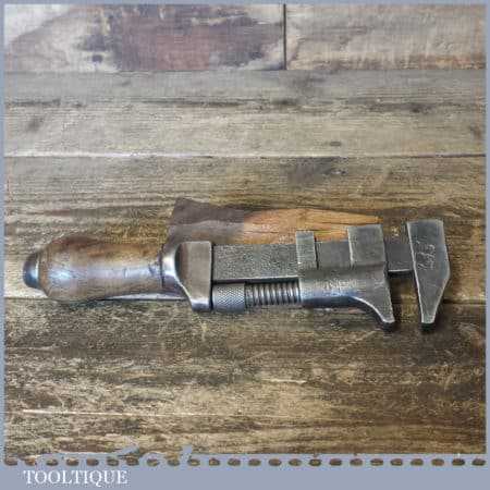Vintage adjustable automotive spanner wrench with wooden handle, in fair used condition. Note: Old age crack in the handle