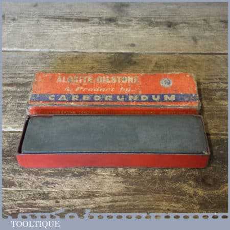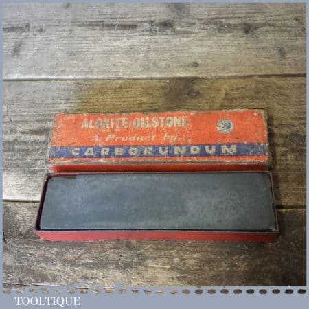 Vintage Aloxite 8” x 2” x 1” fine carborundum oil stone in its original box and in good used condition. Note: a chip to one edge hence price.