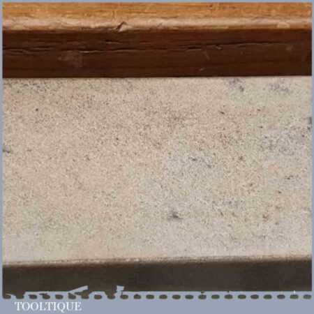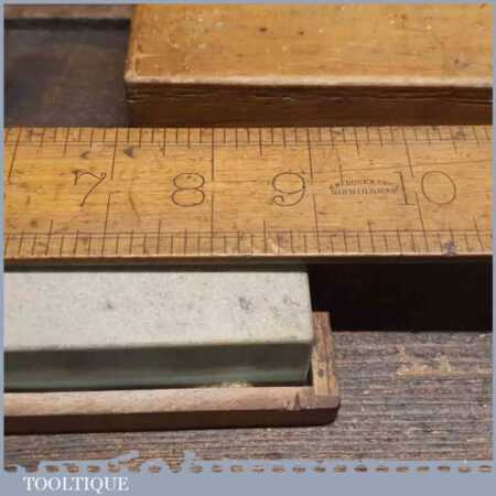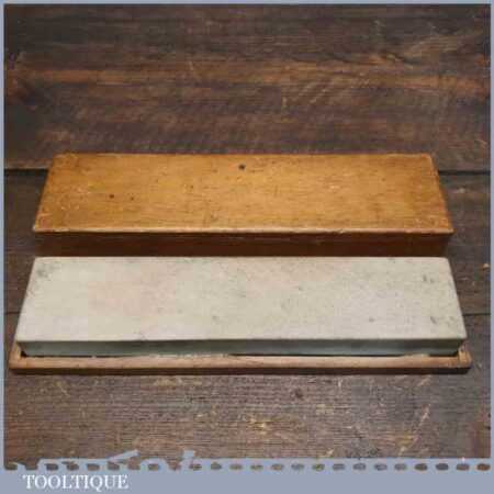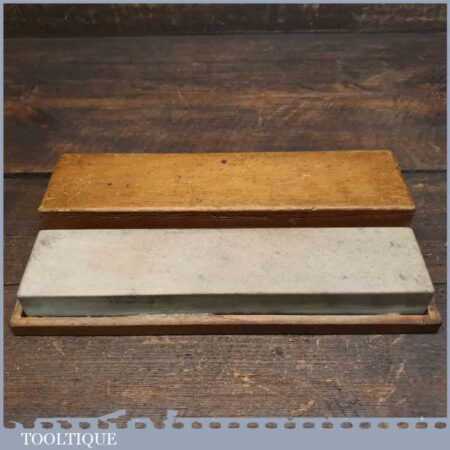Vintage Arkansas 9” x 2” lily white oil stone in beechwood box and in good used condition. Note: lapped flat ready for use