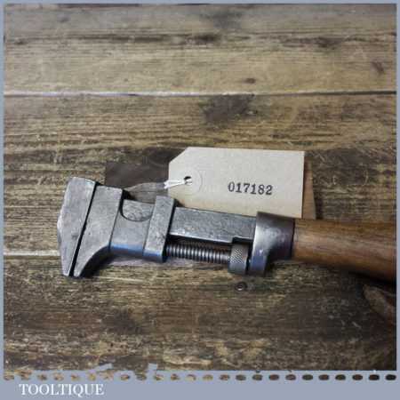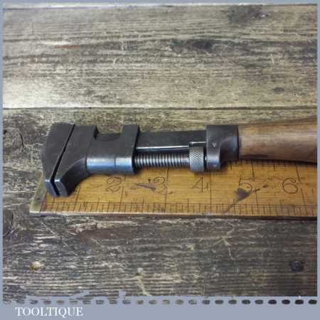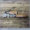 Vintage automotive adjustable spanner wrench with wooden handle, in fair used condition.
