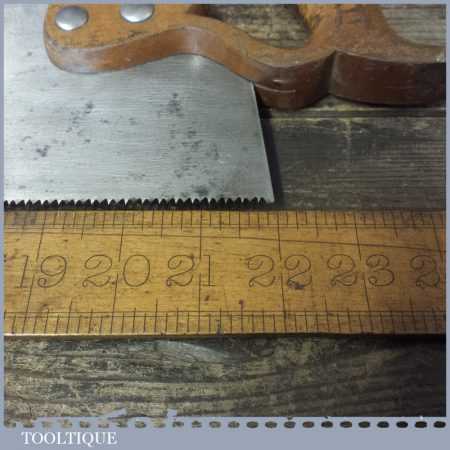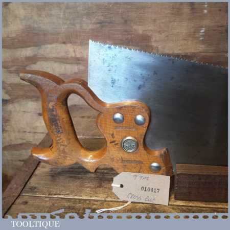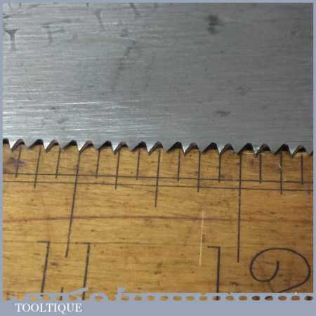The saw has been thoroughly cleaned, jointed, resharpened and set by hand so that all the hard work of getting an old vintage saw right has been undertaken. We do this so that the next sharpening is easier and no more than a quick freshen up would be required. Those who are familiar with sharpening will know this is no small job and requires skill, effort and time to achieve good results.