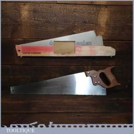 Vintage Baier of Germany 22” ‘Masterpiece’ cross cut panel handsaw with 7 ½” tpi, fully refurbished and sharpened ready for use. Unbreakable composite wood handle and sharpened very well, nice steel.