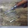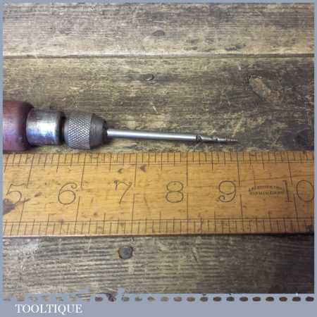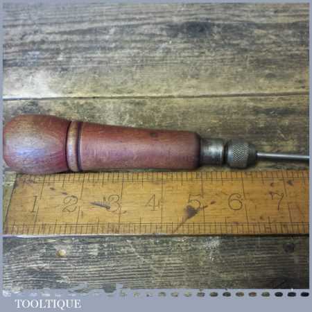 Vintage beechwood and brass multi tool with 9 No: attachments which are encased in the screw top handle, in good used condition.