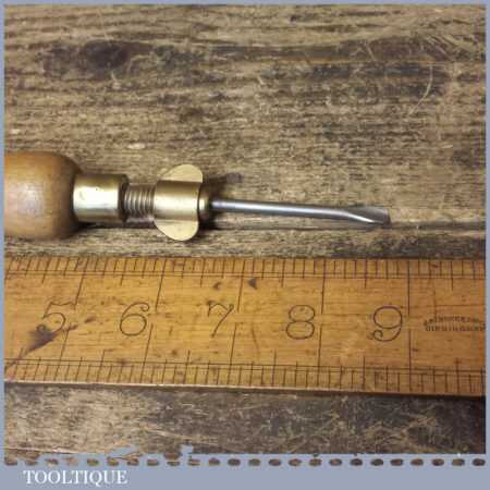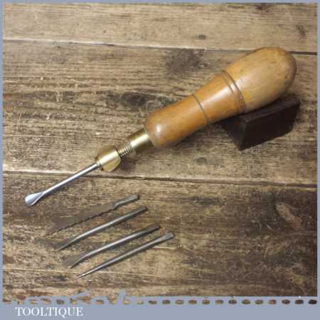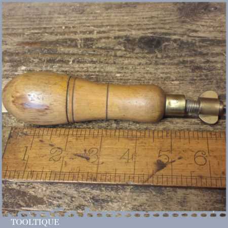 Vintage beechwood and brass multi tool with 5 No: attachments which are encased in the screw top handle, in good used condition.