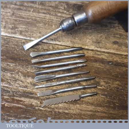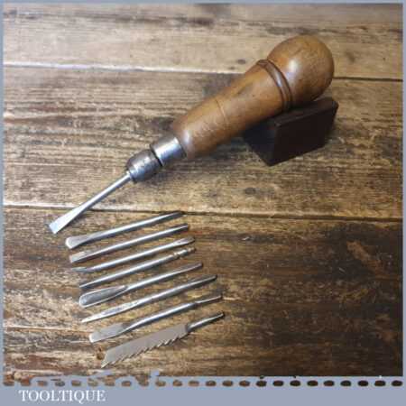 Vintage beechwood and steel multi tool with 9 attachments encased in the screw top handle, in good used condition. Tag Number 19438