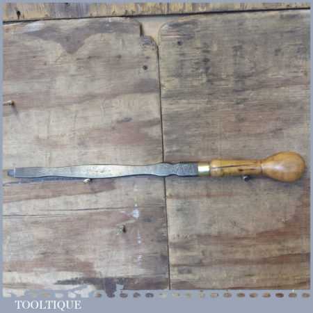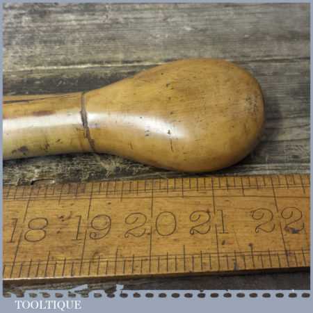 Large vintage blacksmith made cabinet maker’s 20” turnscrew screwdriver with boxwood handle and approx a 7/16” tip in used condition. The handle has split due to expansion but has been filled and glued for added strength and comfort.
