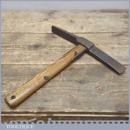 Vintage Blacksmiths hand forged Stone masons strapped hammer chisel with nice wooden handle and is in good used condition.