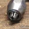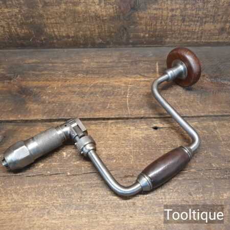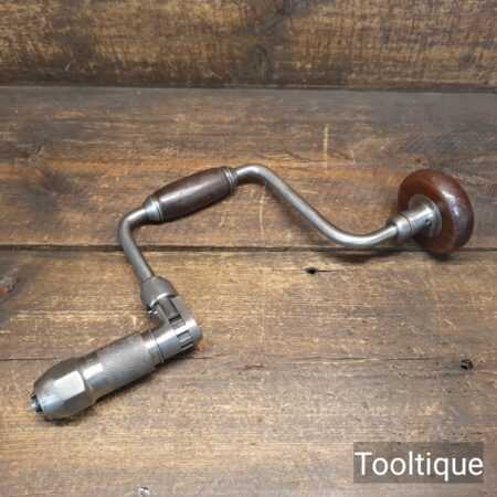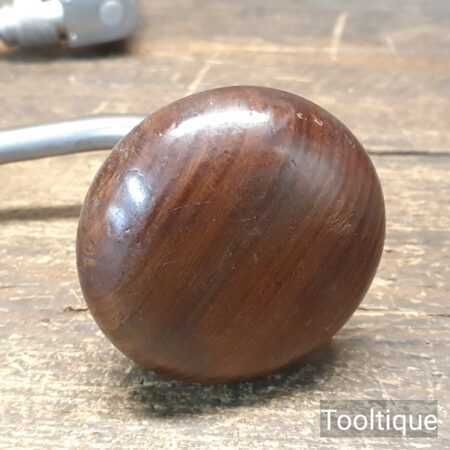 Vintage Blosta German carpenter’s ratchet brace with rosewood handles and a 12” swing in good used condition, refurbished ready for use. This has a four-jaw chuck which is suitable for standard round shank drill bits rather than traditional auger bits with a square shank.